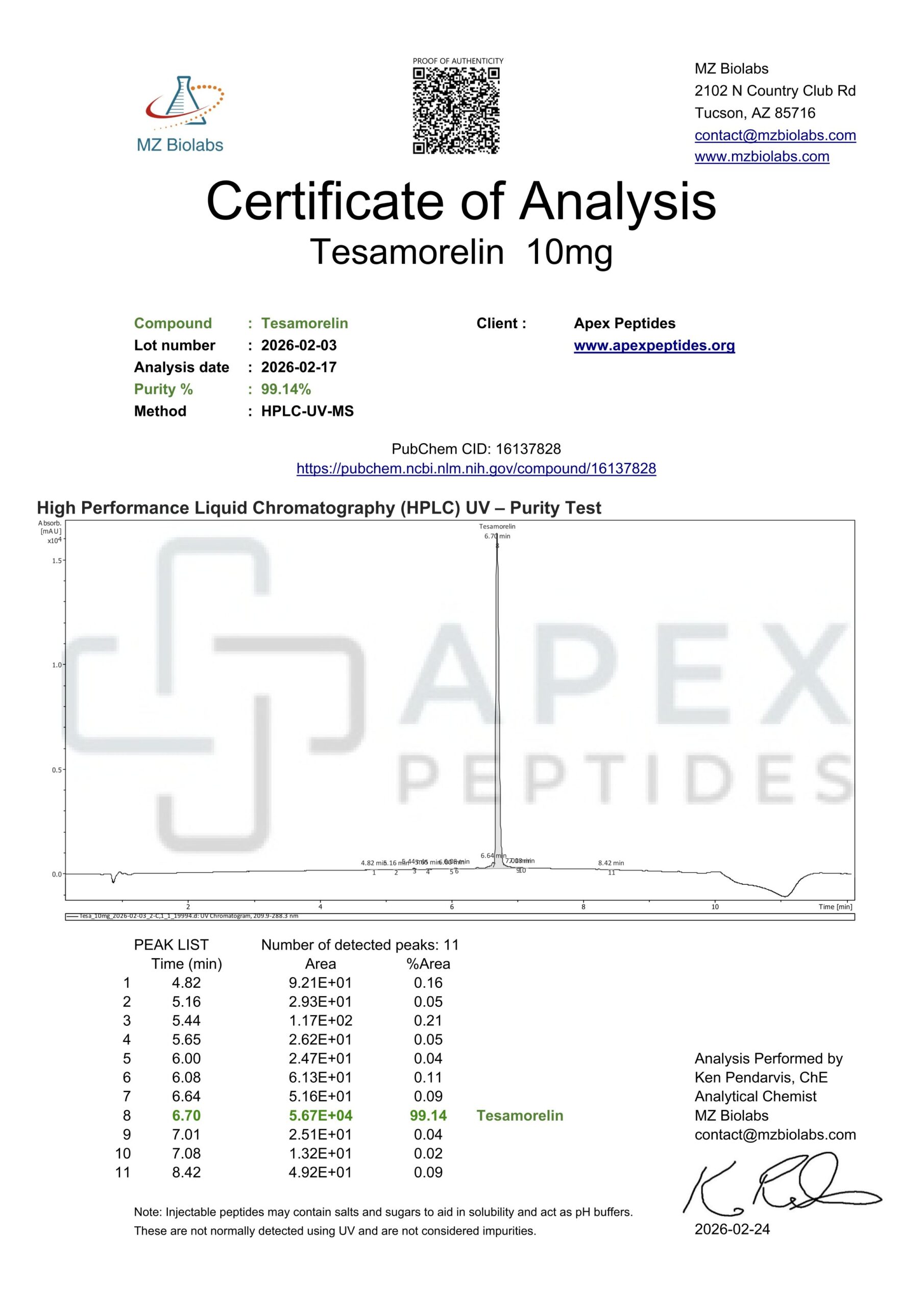 Apex Peptides is a US-based company specializing in 99%+ purity peptides for research use. We pride ourselves on our unwavering commitment to transparency and trust. Each peptide vial you purchase from us is linked to its batch’s Certificates of Analysis (COA) from independent third-party laboratories. These reports detail the results of the peptide you are holding in your hand, ensuring you have complete confidence in the purity and quality of the research peptides you receive. Our mission is your success in research.